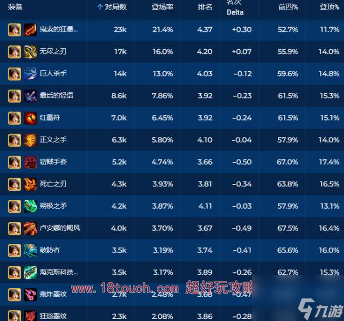 云顶之弈s11霞带什么装备?新赛季霞洛是五费卡,当放在后排的时候是霞作为AD输出角色登场作战,下面为小伙伴们推荐一下高胜率霞的装备选择,方便玩家们参考和合成。云顶之弈s11霞装备推荐1、s11霞的装备推荐带AD输出,优先羊刀无尽巨杀。其他的物理输出装备像是红buff、轻语、正义之手、死亡之刃等也可以带。2、霞的装备以及胜率情况如下图所示:3、霞作为五费卡的主