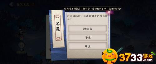 阴阳师外出游玩时铃鹿御前最不擅长什么?这是阴阳师7月14日萤火溪流答题活动中的问题,我就给大家带来了阴阳师7.14仲夏凉行萤火溪流答案,感兴趣的小伙伴一起来看看吧。 7.14仲夏凉行萤火溪流答案一览 题目:外出游玩时,铃鹿御前最不擅长什么 选项: A、放烟火 B、寻宝 C、烤鱼 正确答案:烤鱼上面即是阴阳师外出游玩时铃鹿御前最不擅长什么?7