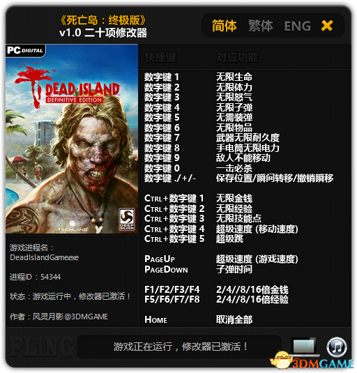 死亡岛终极版修改器用法对应游戏版本:v1.0 如无意外全部或部分功能也会支持其他后续版本下载进入基本功能:点击简体、繁体、English,可以切换语言 (切换语言后修改器将把该语言设置为默认语言)点击音乐图标,可以开启 关闭音乐,游戏开始后会自动关闭音乐。点击笔记本电脑图标,即可用普通数字键代替小键盘里的数字键。按Ctrl+Shift+Home,可以关闭快捷