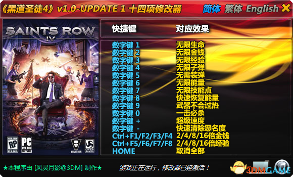 黑道圣徒4 无限弹药能量技能点秘籍 十四项修改器对应游戏版本 :v1.0-UPDATE 1 如无意外(全部 部分功能)也会支持其他后续版本下载地址:3DM下载站: https: dl.3dmgame.com 201308 36605.html基本功能:点击简体、繁体、English,可以切换语言 (切换语言后修改器将把该语言设置为默认语言)点击音乐图标,可