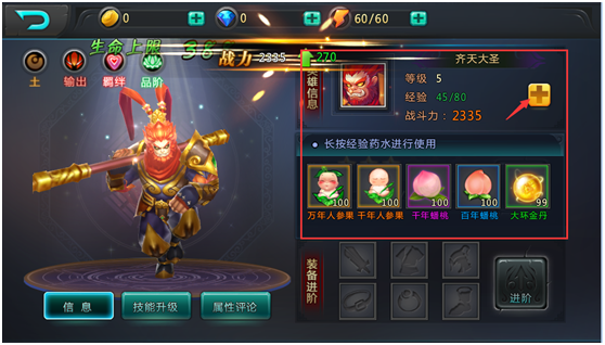 在猴哥去哪儿(海量特权)中,战力要怎么提升呢?我就给大家带来战力提升方法! 猴哥去哪儿(海量特权)战力提升方法 英雄升级 英雄信息界面,点击箭头所指的按钮,使用经验药水,提升英雄等级来提升战力。 英雄升星 英雄信息界面,当英雄元神数量达到可以升星的数量时,点击“升星”按钮,提升英雄星级来提升战力。 英雄进阶 当英