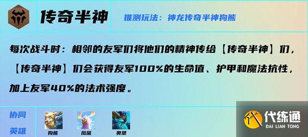 云顶之弈s7传奇半神阵容怎么搭配?云顶之弈s7传奇半神羁绊怎么搭配阵容?云顶之弈s7传奇半神羁绊推荐阵容是什么?传奇半神是云顶之弈中的一个羁绊效果,在云顶之弈更新s7赛季之后,这个羁绊也发生了新的变化和搭配,很多玩家都想知道云顶之弈s7传奇半神阵容招募搭配。云顶之弈s7传奇半神阵容玩法攻略一、羁绊详情棋子:狗熊,凤凰,奥恩传奇半神羁绊效果:每次战斗的