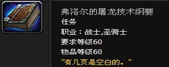 魔兽世界怀旧服屠龙纲要是什么东西?在魔兽世界怀旧服游戏中,不少小伙伴不太清楚屠龙纲要的用途,接下让我来聊一聊,感兴趣的小伙伴们快来看看吧! 魔兽世界怀旧服屠龙纲要是啥东西: 弗洛尔的屠龙技术纲要是游戏中的一本书,能触发一个战士和圣骑士专属任务,任务奖励是单手剑“奎尔塞拉”。厄运之槌所有的boss都有0.3%左右的几率掉落弗洛尔的屠龙技术纲要