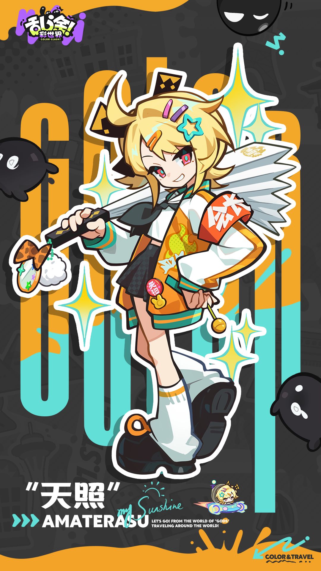 乱涂彩世界天照角色介绍,乱涂彩世界天照档案!在乱涂彩世界游戏中属黄色系,以八百万神明高中学生会会长身份立于众人之上。一颗狂热偶像宅的心援棒