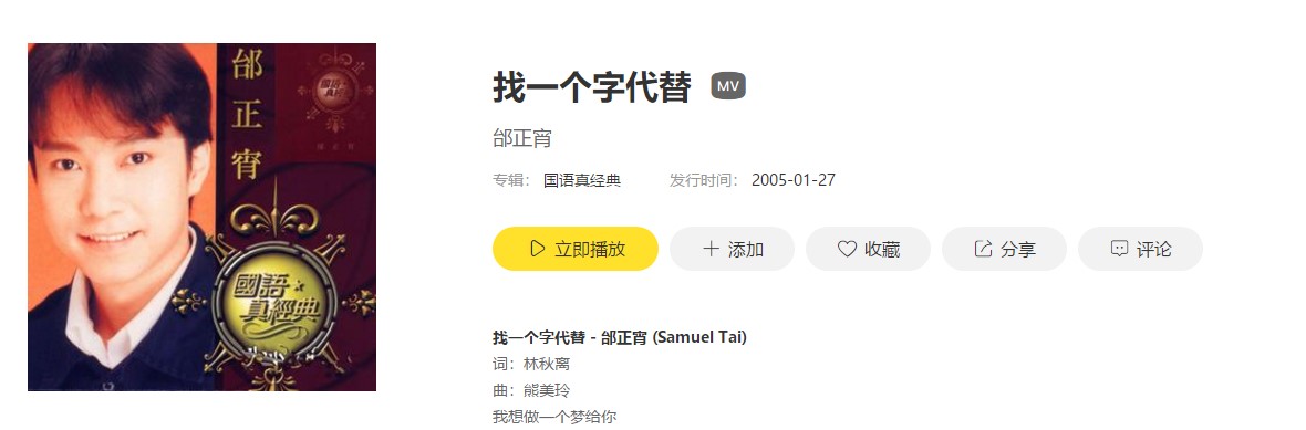 抖音我想做一个梦给你是什么歌呢?这首歌在抖音上现在很火,很多小伙伴都很想知道歌曲名字是什么,那么不知道的小伙伴就看看我整理的相关介绍吧。 我想做一个梦给你是什么歌 歌名:找一个字代替歌手:邰正宵找一个字代替试听 点击试听 找一个字代替歌词词:林秋离曲:熊美玲我想做一个梦给你填满你心中 所有空隙让流过泪后的苦涩 转成甜蜜我想摘两颗星给你放在你