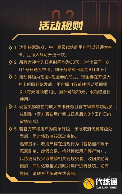 暑假之际,各地升温,小伙伴们是不是都在空调房内不愿意出门呢?三伏天即将来临,代练通官方又开始来送“凉爽”了,这次为小伙伴们带来了代练专属高额返现活动,下面一起来了解一下活动规则吧。根据官方活动安排,此次活动将持续一个月(7月16日-8月15日)官方给代练朋友们准备了任意游戏为中、高级代练即可免费开通超级大神卡及权益大神卡,领专属卡完成任务后将