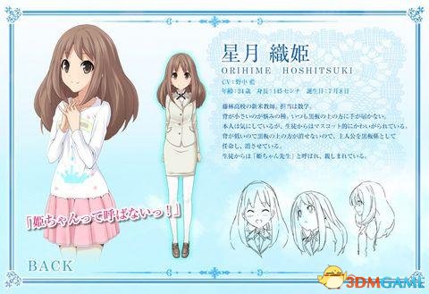 游戏一共有19个结局,织姬5个,丽莎2个,诗名2个,霞2个,千夏3个,剩下的全BedEnd。织姬这个角色比较传统,既然游戏的主人公是高中生,那么老师角色就成了生活中一定会有的角色,这也可以算是一种套路了。织姬的特点是虽然已经24岁了(按照官方年表是1983年出生,那么游戏就是发生在2007年)但身高只有1米45,个性则是十分孩子气,班上的大部分学生甚至以为老