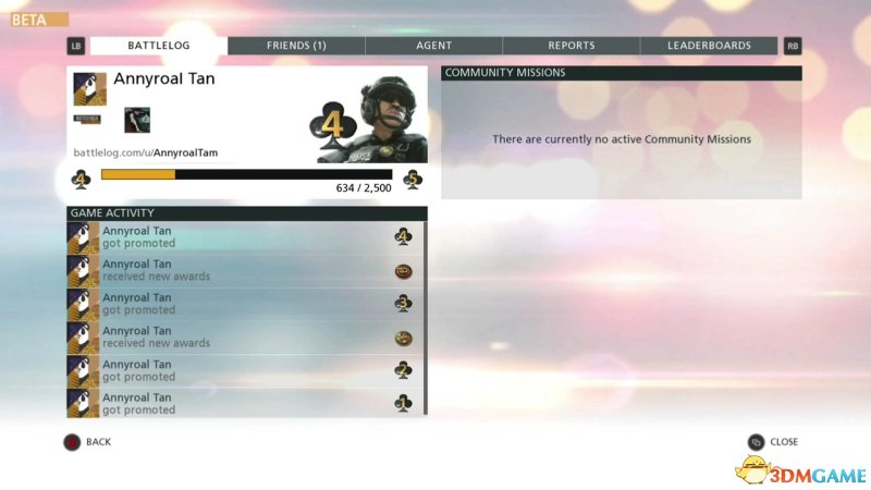 战地:硬仗战地日志Battlelog图文详解,是什么意思。战地日志首页可以查看玩家当前的等级、查看玩家的战地日志网页版的链接、查看玩家在战地当中的活动(如晋升、得到奖励都会在活动中显示)、查看当前社区任务(当战地:硬仗正式开售之后就会有社区任务领取)。玩家等级:等级提升是需要经验,而经验可以通过击杀敌人、助攻击杀敌人、驾驶载具、击落载具、助攻