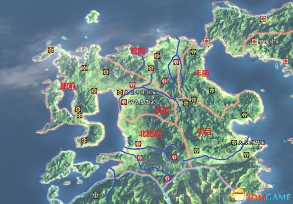 信长之野望创造:战国立志传 全地区种田适宜性评价谈论自己对地区种田的想法,水流附近可以加治水,可以种水田,也就是现在的水田暴兵流。那么下面就开始至西往东的图文介绍,红色-国名,深蓝色-水流,其他应该都看的懂,仅此对于山川的覆盖率来给与种田的理想性用SABC来评价。1、九州地区 1,萨摩:山地少,水流集中在北部(B+)2,大隅:山地多,水流集中在北