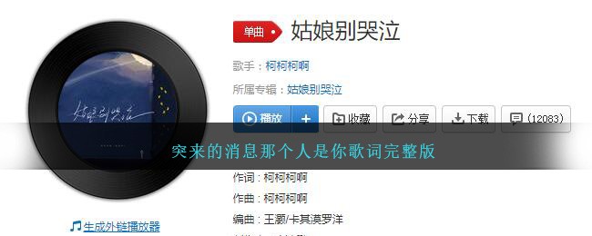 突来的消息那个人是你是什么歌名?这是近期在抖音上非常火的一首歌,相信不少的小伙伴都有刷到过,突来的消息那个人是你来自姑娘别哭泣,是柯柯柯啊演唱的歌曲,发行于2023年8月23日,收录于同名专辑姑娘别哭泣中。给大家带来了突来的消息那个人是你歌词完整版分享,需要的来看看吧!突来的消息那个人是你是什么歌名歌名是:姑娘别哭泣,是柯柯柯啊演唱的歌曲,发