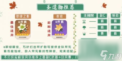 原神枫原万叶是稻妻的流浪武士,是五星风系单手剑角色。万叶有着非常完善的增伤辅助机制,其风元素的扩散能力使得他可以搭配非常多的强势配队,很多小伙伴对万叶的圣遗物词条的选择还不了解,下面我给大家带来了万叶的最佳圣遗物词条选择。原神万叶圣遗物搭配原神万叶圣遗物套装及主词条搭配推荐 " >圣遗物:翠绿四件套解析:1、主词条:时之沙、空之杯、理之
