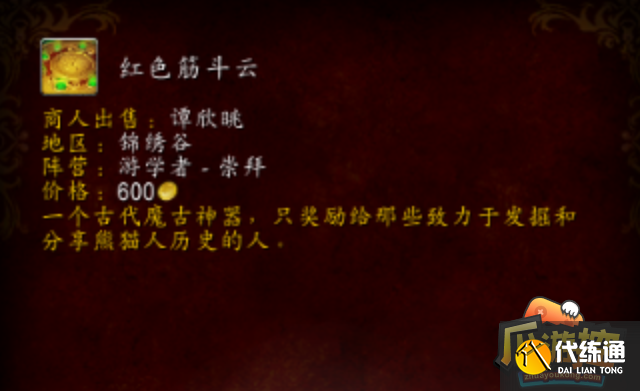 需要达到潘达利亚声望游学者崇拜,在锦绣谷闻道之座购买。 类别:飞行 装绑:否 潘达利亚-锦绣谷-闻道之座的谭欣眺(82.2, 29.4)。 注意崇敬后先购买游学者大奖章使用,战网下所有角色声望获取速度+100%(所有途径)。