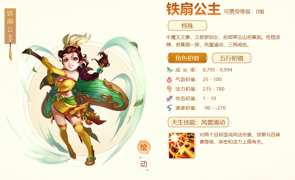 一、基础介绍1.铁扇定位为负敏法宠,优秀的法力初值780点几乎是特殊召唤兽独一档的存在;100点的气血初值也具有了一定的存活能力;2.技能格子为八开,自带天生技能。3.自带技能为风雷涌动,对两个目标造成风法;4.觉醒技能为煽风点火,释放风法后,有至多70%的概率施法单体火法追击一个随机目标;理论上铁扇公主回合可攻击9次!觉醒突破所需玄元丹分别为15 30 6