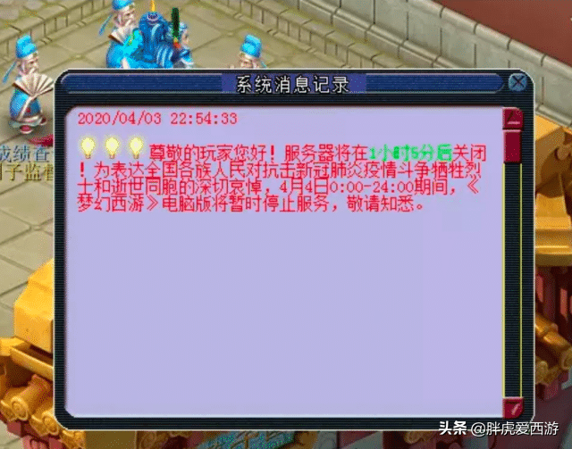 面对游戏停服,玩家更多的是对疫情工作人员的祝福4月3日梦幻西游官方为了响应号召,为了疫情期间牺牲的烈士,逝去的同胞,主动停服一天,而许多人不知道的是,就在4月3日晚上,所有在线的梦幻西游玩家,提前在传音频道,世界频道为疫情期间奋斗在第一线的工作人员,医护人员送上祝福,为逝去的英雄和同胞们默默哀悼。虽然我们中的许多人在抗疫期间只能够留守在