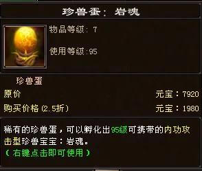 岩魂宝宝为网游天龙八部游戏中最早出现的一种珍兽宝宝,传闻岩魂是山中怪石经过千百年的风雨雷电淬炼,渐渐诞生了一丝灵智,后幻化为了岩魂。岩魂宝宝一直存在于元宝商店中,珍兽蛋:岩魂,售价为1980元宝,岩魂是95级可以携带的宝宝,属于内功攻击型灵气资质的宝宝,二代珍兽共有8种变异等级,如下图所示;未繁殖的岩魂宝宝图样。一级变异的岩魂宝宝图样。二级