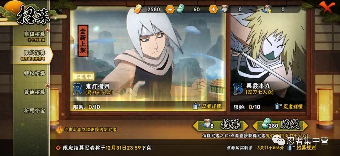嗨喽,各位小伙伴们大家好。今天小编为大家带来的是本周活动介绍,各对此感兴趣的玩家就和小编一起往下看吧!详细介绍十二月限定招募12.1起这次上架了之前就预热了很久的忍者鬼灯满月以及栗霰串丸,大家可以选择召唤自己喜欢的忍者,鬼灯满月需要消耗8个招募令,金币是3840金币,想...