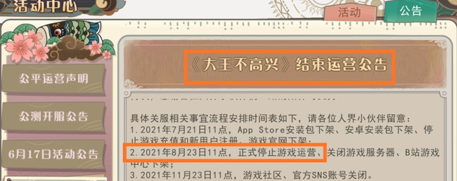 大王不高兴下架最直接的原因可能就是玩家流失过多官方不够认真的运营和更新,而且月流水量也逐渐不足。【大王不高兴】自2020年1月9日上线以来,与各位人界小伙伴们在此相遇,经历了各种各样的冒险,承蒙各位人界小伙伴们一直以来的陪伴与支持,我们才能走到现在。非常遗憾的是,由于多方原因,我们不得不宣布【大王不高兴】将于2021年8月23日(星期一)正式结束运营