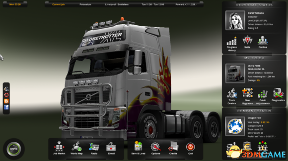 欧洲卡车模拟2模拟的真实卡车情况,真的很好玩,一玩就上瘾,横穿欧洲之旅,难以想象制作公司是怎么做到的,才700MB大,画面绝对够上乘。游戏拟真度很高,方向需要适应一下,另外可以改装车辆,你可以像开真车一样的来认真开,遵守交规很重要,另外高速上开启巡航还是很轻松的,听着音乐享受旅途美景。鉴于部分刚接触的玩家不知道怎么玩,下面就做了一个图文教
