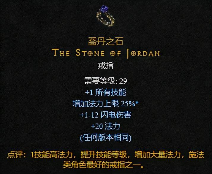 乔丹之石首先他是一个暗金装备,可以说是施法职业最好的暗金戒指,+1所有技能,增加法力上限,还能直接增加20点的法力,乔丹之石没有变量,价格相对稳定,目前在25RMB左右其次就是大家熟知的,有些人参加过有些人没参加过的召唤超级暗黑破坏神的世界事件的钥匙,需要出售75-12...