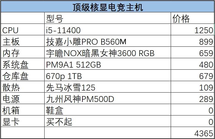 本人被目前的DIY市场彻底整服了,所谓甜点级显卡动辄大几千,为玩个游戏花那么多钱值得吗?而随着核显性能的不断提升,没有独立显卡的电脑也能基本流畅的运行主流电竞网游。因此非必须用到独显的情况下,还是再等等为好,毕竟都等了一年,再等段时间也无所谓。鉴于最近评测CPU、SSD、内存的活较多,利用手头压箱底的技嘉B560M AORUS PRO主板配个i5 11400