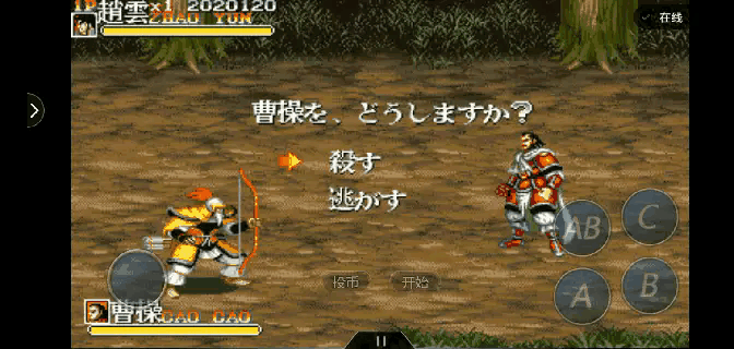 玩家可以有五个角色供选择的:将操作关羽、张飞、赵云、魏延、黄忠 等 5名蜀汉大将与魏国奸雄曹操争夺天下统一。游戏道具介绍:各种古代武器(飞刀不能发光,其他武器使用发红光)都换成相应的加强版武器当然更多的宝箱中有鸡腿桃子(补血道具)宝剑草擞或圣剑金元财宝等道具。游戏操作:圆形键盘上下左右移动A-攻击,B跳,A+B抓住敌人 B,A(坐)AB一键必杀技左或右B,A