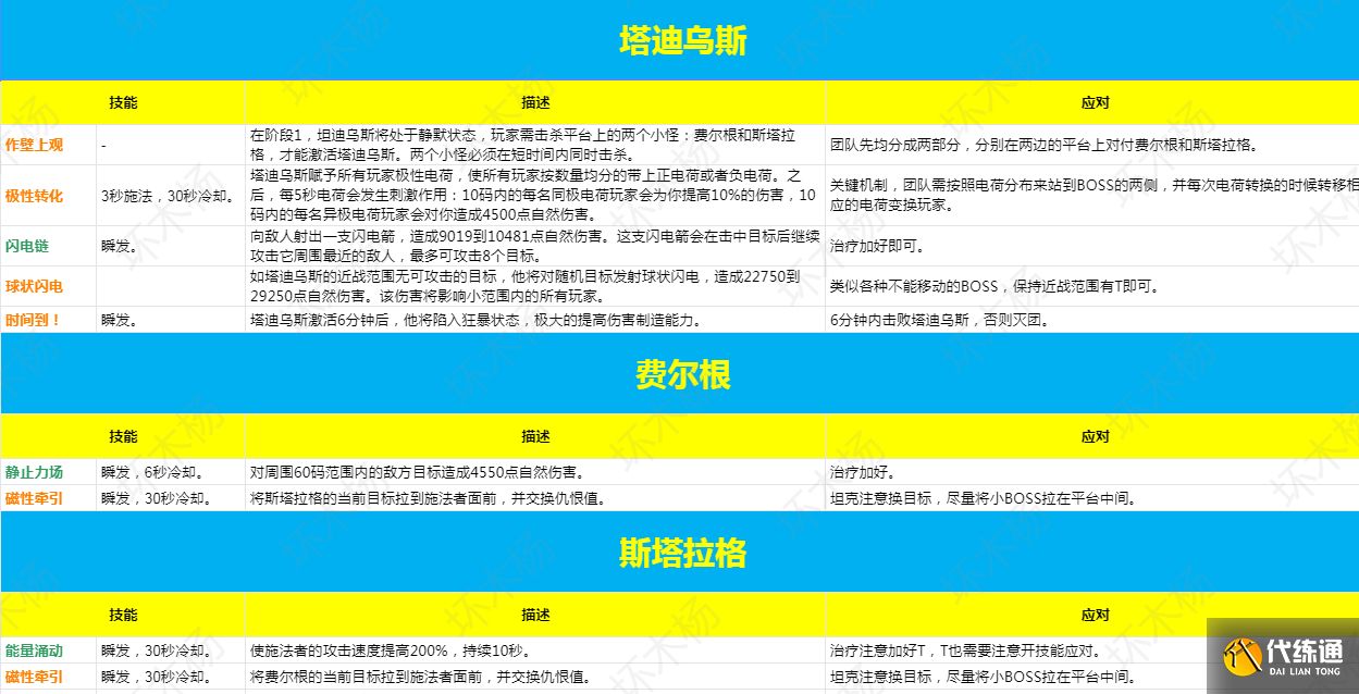 在魔兽世界WLK怀旧服中,纳克萨玛斯的塔迪乌斯怎么打,塔迪乌斯打法攻略。坏木杨BOSS技能手册总览塔迪乌斯是构装区的最终首领,是一个以闪电获得生命的血肉傀儡。无数的冤魂被禁锢其中不得脱身,周身散发着悲哀的气息。他和两个小型构装体——弗沃根和斯塔拉格,共同镇守构装区的核心实验室。团队配置普通难度:2名坦克,3-4名治疗人员以及4-5名输出。英雄难度:2