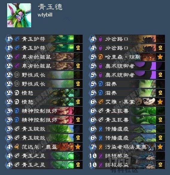 最近,知名斗鱼主播方丈bill在第二届ESport Superstars中杀出重围,夺得冠军,其所使用的青玉德卡组也受到的人们的关注。经过笔者尝试,现将这套卡组以及使用心得分享给大家。 卡组如下:代码: AAECAZICBJAHrqsClL0CmdMCDV eBcQG5Ai0uwLLvALPvALdvgLfxAKgzQKHzgKe0gLb0wIA 这套