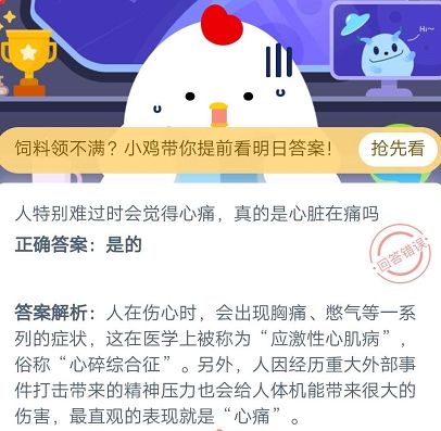 支付宝蚂蚁庄园小课堂7月2日每日一题答案是什么?支付宝蚂蚁庄园小课堂每天的凌晨更新一道题目,答对后能领取小鸡饲料,的问题是“人特别难过时会觉得心痛,真的是心脏在痛吗?”不知道答案的朋友不妨随三大妈我一起来看看吧。 庄园小课堂往期答案汇总人特别难过时会觉得心痛,真的是心脏在痛吗? 不是,是心理作用是的正确答案:是的 答案解析:人在伤心时,会出现