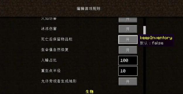我的世界死亡不掉落指令是什么?在我的世界游戏中,死亡是玩家常遇到的挑战之一,而每当玩家死亡时,掉落的物品往往需要花费大量时间和精力去重新收集,有时玩家并不希望因死亡而丧失手中的重要物品,通过死亡不掉落指令,帮助玩家在死亡时保留所有物品,相信有不少小伙伴都不知道怎么开启这个功能,那就赶紧来看看下面的介绍吧。