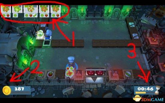 【胡闹厨房2】在热闹的混乱场面和头脑策略方面提供了一个更好的平衡。厨房之中有更多可移动的部件,食谱的种类也更加多样化,可以投掷配料的全新设定则从根本上改变了这款游戏的玩法。接下来小编给大家带来的是【胡闹厨房2】新手入门图文指南,希望对各位玩家有所帮助。玩法解析如下图箭头1所指,这里是菜谱,所谓的菜谱,就是客人点的餐,可以当做是任务,