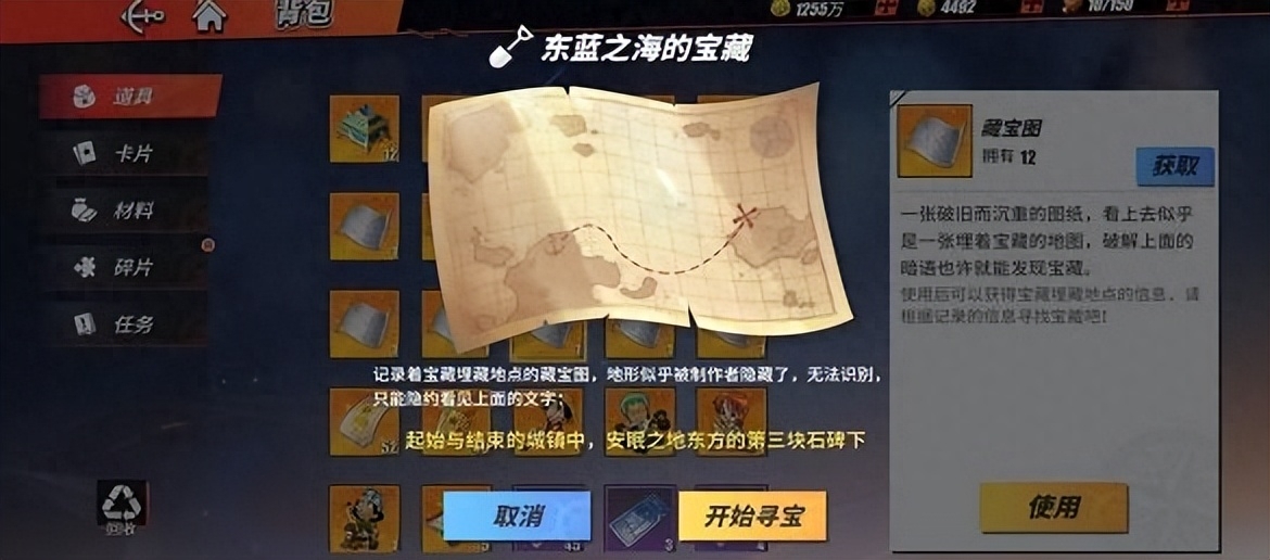 玩家如果想获得宝藏,必须要开启自己的寻宝任务,选择之后玩家就可以进行寻找宝藏了,东蓝之海的宝藏主要有着五个,具体的位置分别在最东方的风车脚下、灰白海岸上、海王陨落之地的河流、双子巨塔以及东方第三块石碑下。