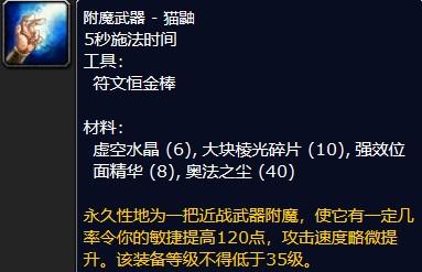WOW猫鼬附魔的材料?猫鼬附魔所需的材料是虚空水晶、大块棱光碎片、强效位面精华和奥法之尘。当玩家的背包中拥有6个虚空水晶、10个大块棱光碎片、8个强效位面精华和40个奥法之尘时,就可以使用附魔专业的附魔技能为武器附魔猫鼬。魔兽附魔玩法附魔是适合高级玩家的一个高级技能。需要花费大量的功夫来学习。附魔师需要一定的供养。这一点是预期的。你的所有公会