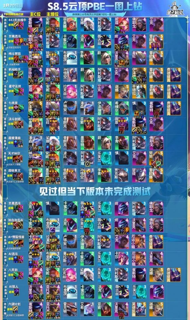 新赛季改动已经只差最后一个版本3月23日定稿上线了,大阵容方向已经基本研究出来了,局局可以看体系装备就强行玩的运营有442灵能福牛、未来强势、至高混沌、星守妮蔻、格斗贾狼,看特定强化玩的爱心潘森、决斗剑姬、七未来、六源计划、天才纳尔都算新阵容,老的金钟罩、不屈、罪恶快感什么的也都差不多。S8.5最变态的阵容毫无疑问是卡牌两星成型就直接无脑连胜上9