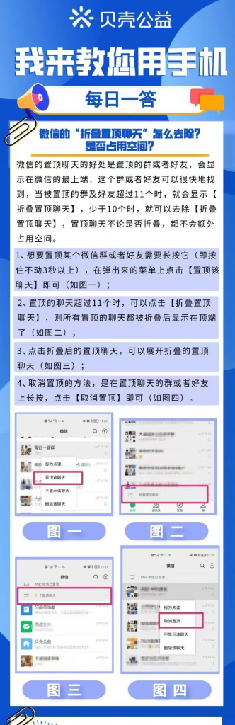 微信的“折叠置顶聊天”怎么去除?是否占用空间?微信的置顶聊天的好处是置顶的群或者好友,会显示在微信的最上端,这个群或者好友可以很快地找到,当被置顶的群及好友超过11个时,就会显示折叠置顶聊天,少于10个时,就可以去除折叠置顶聊天,置顶聊天不论是否折叠,都不会额外占用空间1、 想要置顶某个微信群或者好友需要长按它(即按住不动3秒以上),在弹出来
