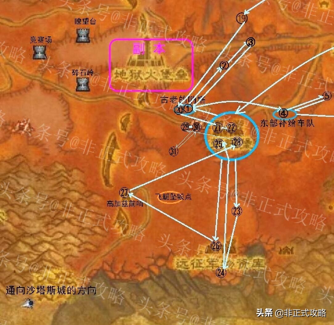从古老的哨塔出来,回到荣耀堡,这一篇的任务主要路线是从荣耀堡 → 远征军物资库 → 高加兹前哨→ 矿洞 →飞艇坠毁点 。