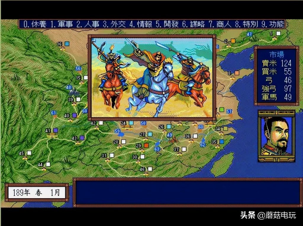 一、游戏简介 这是由光荣公司推出的以三国为背景的策略性游戏。要求玩家选择一路诸侯,率领历史的精英去争夺天下。游戏中的人物多达531位,城池为46座。占领所有46座城池,即统一天下。在46个城池开辟了22块战略要地,如街亭、虎牢、赤壁等,只有占据了有关的战略要地,才能进而攻击敌城或防止敌人一步跨到城下。战争场景全都改为三维动画,并增加了单挑。单