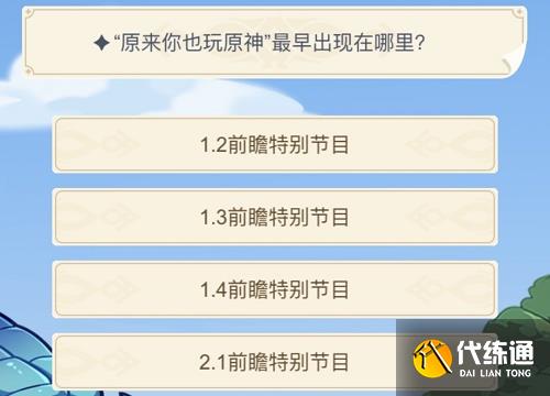 原来你也玩原神是原神前瞻直播里面出现的一句话,这次的问题就是问这句话具体出现在哪里,那么这句话具体出现在哪个直播上呢,不知道答案的玩家可以来看看。原神周年20问答案大全原神原来你也玩原神最早出现在哪里答案介绍正确答案:B(1.3前瞻特别节目)问题详情:“原来你也玩原神”最早出现在哪里?A、1.2前瞻特别节目B、1.3前瞻特别节目C、1.4前瞻特别节目D、2.