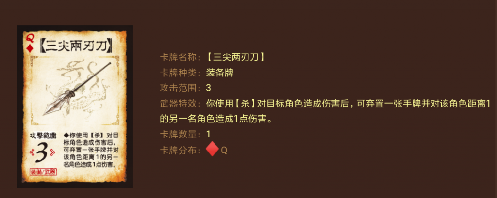老版本国战规则牌堆数量:国战使用的牌堆一共108张牌,其中20张装备牌,34张锦囊牌,54张基本牌。最开始的武将数量是60位。后加入阵包和势包达到74位武将。本次不具体讲武将,以后有机会再详细讲解武将。20张装备牌:3张防御马、张进攻马、藤甲、白银狮子、仁王盾、八卦阵、麒麟弓、朱雀羽扇、丈八蛇矛、贯石斧、三尖两刃刀、吴六剑、寒冰剑、雌雄双股剑、青釭剑、
