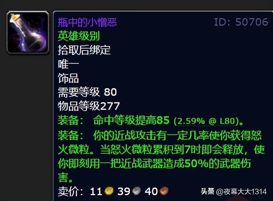 众所周知,在魔兽世界80级年代,只要打过冰冠堡垒,就一定知晓死神的意志这个饰品。不过该饰品未必适用于所有职业,惩戒骑便是其中之一。个人感觉,惩戒骑的最强饰品,当属25H普崔塞德教授掉落的:瓶中的小憎恶。加85点命中,特效是近战攻击有一定几率让你获得怒火微粒,当怒火微粒累积到7层时就会释放,立刻对敌方造成50%的武器伤害。到了ICC版本,惩戒骑的数量肯