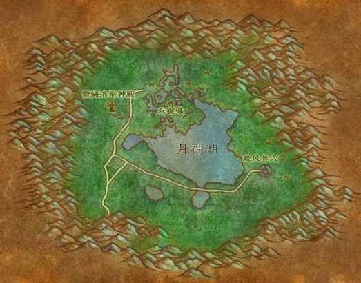 我带大家进入月光林地。月光林地位于费伍德东面,沿着海加尔圣山的低坡恰好在冬泉树林的北面。木喉熊怪的隧道是进出这一地区的唯一通道(除了角鹰兽和魔法以外),它位于月光林地西南方。月神湖浩淼庞大,它位于月光林地的中心。永夜港是月光林地唯一的主要定居点,而德鲁伊、哨兵和树妖们在永夜港外搭建了一些小型营地。雷姆洛斯神殿是守护者雷姆洛斯的家园