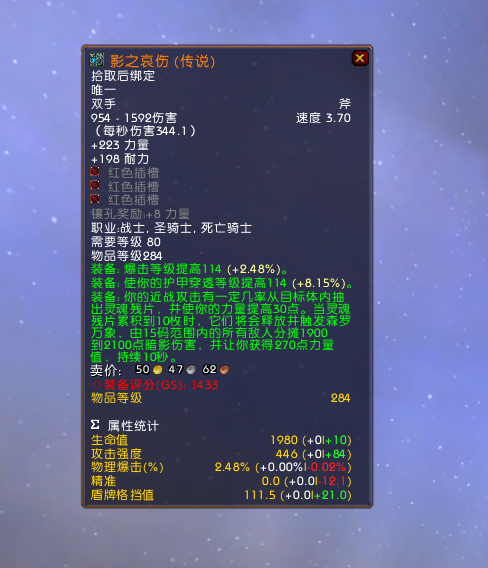 影之哀伤是WLK版本的橙色武器,属性没得说非常给力,是战士、圣骑士和DK的专属武器,被玩家称之为“橙斧”。80级有2把橙色武器,相比橙锤(瓦兰奈尔·远古诸王之锤)橙斧的知名度更大一些,因为当年国服上线WLK版本橙锤就过时了,橙斧是随后才上线的,所以当时制作橙斧的玩家大于制作橙锤的玩家,橙斧的名气才大于橙锤。还有一种说法是橙锤是治疗的武器,橙斧是输