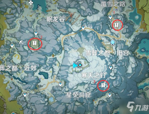 原神山中之物任务的碎片怎么解冻?玩原神的小伙伴在做山中之物的任务的时候需要去解冻三个碎片。这三个碎片分布的还是很分散的,山中之物三处封印的位置如下图任务标记所示:第一处覆雪之路的封印只要将附近的深赤之石打碎拾取后攻击封印即可第二处雪葬之都的封印只要先启动机关然后激活5个冰柱(按仙灵的飞行顺序激活)然后击败3个遗迹守卫,坚冰就会融化可以
