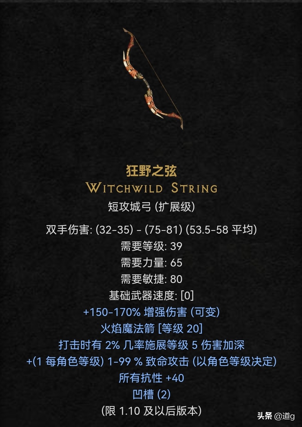 狂野之弦(以下简称狂野)一直以来被暗黑2的玩友认为是二线弓,但我在这篇文章就是要证明狂野是一线弓,而且是有妙用的。在此篇幅较长,希望大家耐心阅读,原创不容易,欢迎各位爱好者关注、讨论与指正。第一部分——我着重介绍一下狂野:如图,狂野初始为短攻城弓的底子,几条属性,几乎条条精彩。(1)2%几率施展等级5伤害加深——PS:亚特玛的圣甲虫项链(以