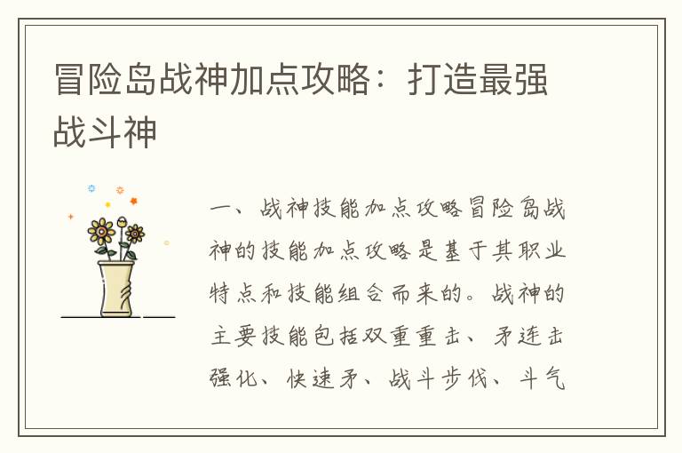 冒险岛战神加点攻略:打造最强战斗神在冒险岛中,战神是一个极具爆发力的职业,其独特的技能组合和强大的装备支持,可以让其在战场上尽情驰骋。然而,要想打造一个最强战斗神,加点攻略是非常关键的。在此将为您详细介绍冒险岛战神的加点攻略,帮助您更好地发挥战神的潜力。