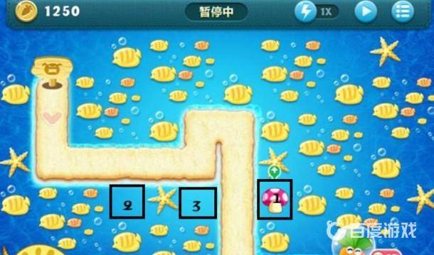 1.在保卫萝卜深海主题的第三关开始时,玩家有1250金钱可以使用,同时系统还赠送了一个深海蘑菇。首先,玩家需要出售深海蘑菇,然后在1号黑色区域建造一个顶级的玩具飞机炮塔,最后在2号和3号黑色区域各建造一个毒针和鱼刺炮塔。