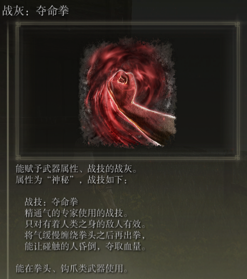 艾尔登法环战灰夺命拳介绍。艾尔登法环这款游戏是一款非常好玩的游戏,这款游戏中有着非常多的新鲜的冒险与奇遇等待着玩家们游玩体验。在这款游戏中,玩家将作为一名褪色者在这个名叫交界地的大陆之中进行战斗,唯一的目标就是成为埃尔等之王,为此需要不断的提升自己的实力,击败各种各样的boss