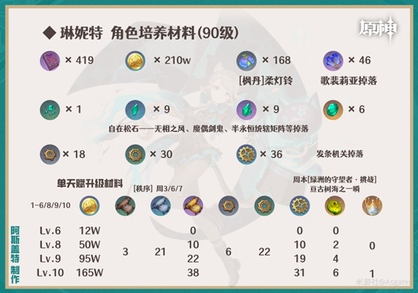 原神琳妮特突破材料一览。原神这款游戏是一款非常好玩的游戏。游戏由上海米哈游公司研发。在这款游戏中,玩家可以体验到丰富的游戏内容。游戏中有着许许多多的游戏模式。玩家可以在这里打牌,建造,种田,探索,培养角色等等一系列操作,每一种都为你带来独特的游戏体验。