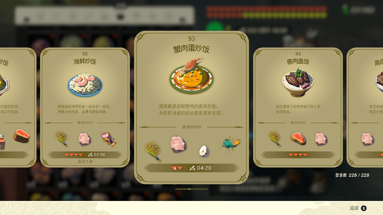 塞尔达传说王国之泪蟹肉蛋炒饭效果分享。塞尔达传说王国之泪这款游戏是一款非常好玩的开放世界游戏。这款游戏是由任天堂发布的一款神作,游戏可以在switch中进行购买游玩。游戏在各种方面都做的非常好,像是游戏画风画质,非常细腻精致,玩法也及其丰富,独特的战斗系统,你可以选择使用远程的魔法消耗也可以近战搏杀,每一种都有不一样的体验。