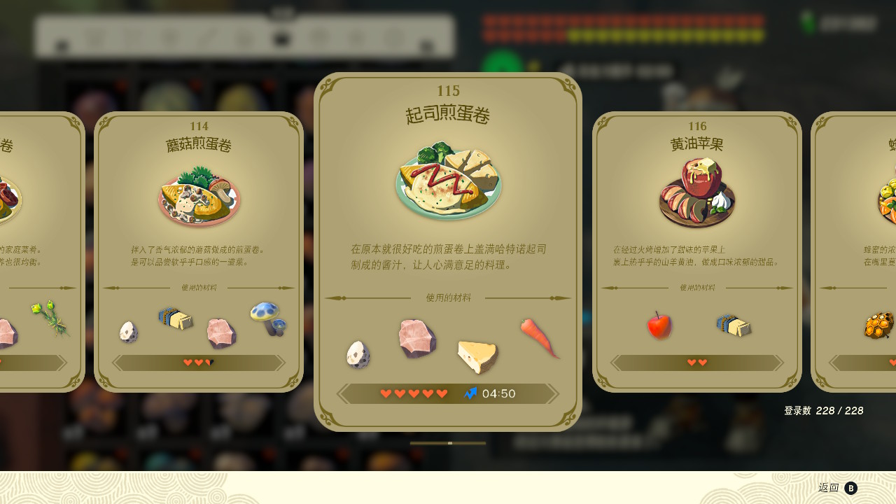 塞尔达传说王国之泪起司煎蛋卷效果分享。塞尔达传说王国之泪这款游戏是一款非常好玩的开放世界游戏。这款游戏中有着非常丰富的游戏内容供玩家们游玩体验。游戏为任天堂推出的一款作品,游戏可以在switch中进行购买游玩。